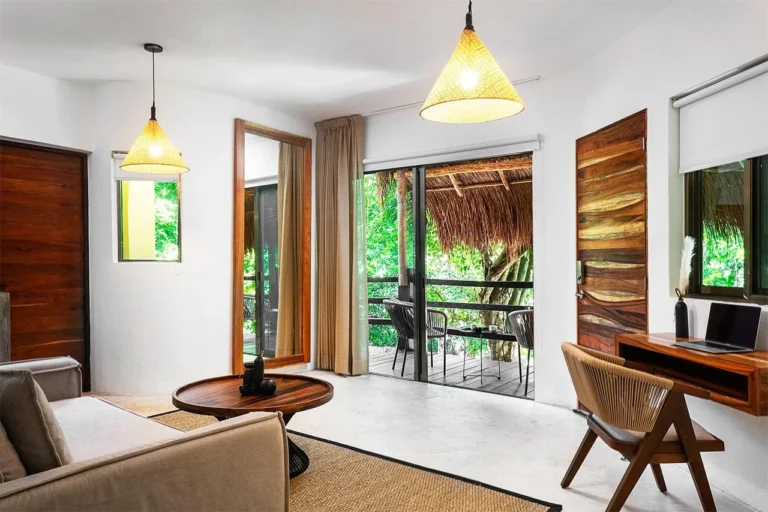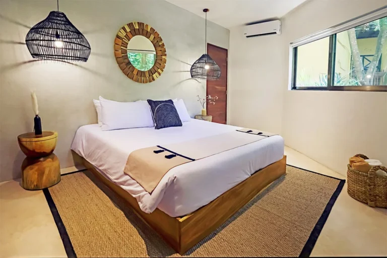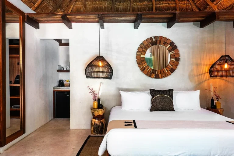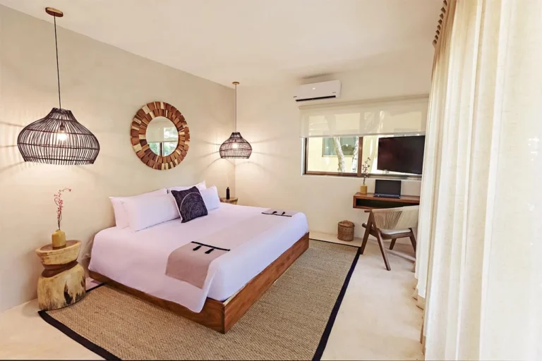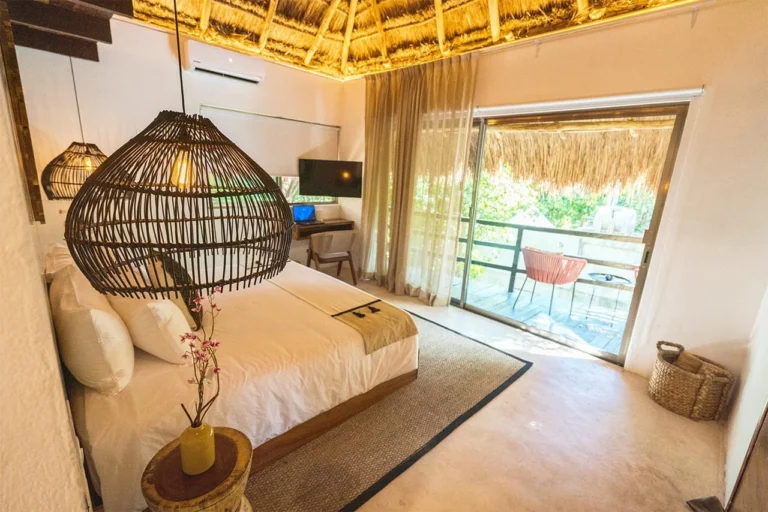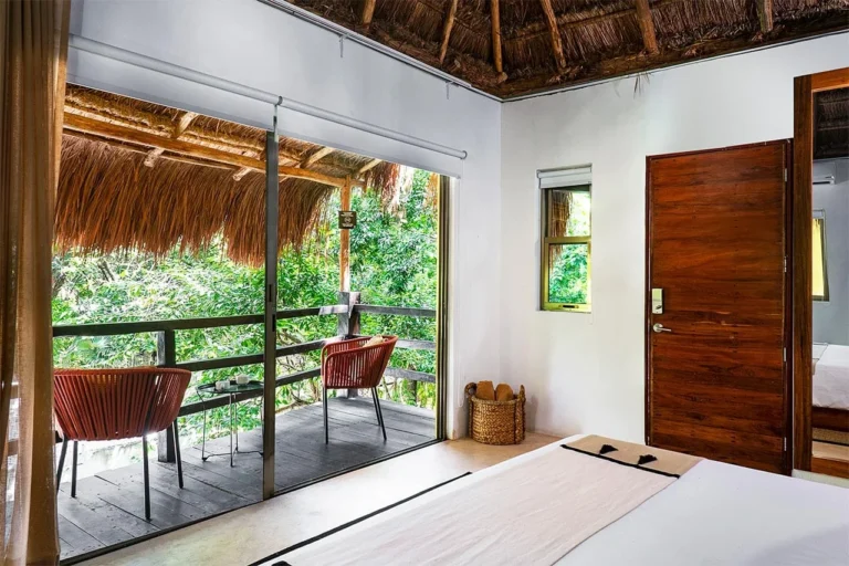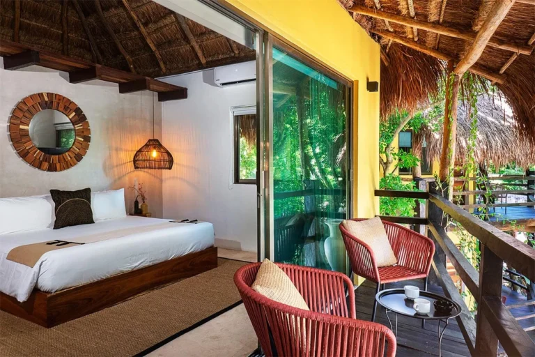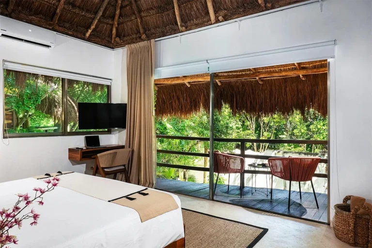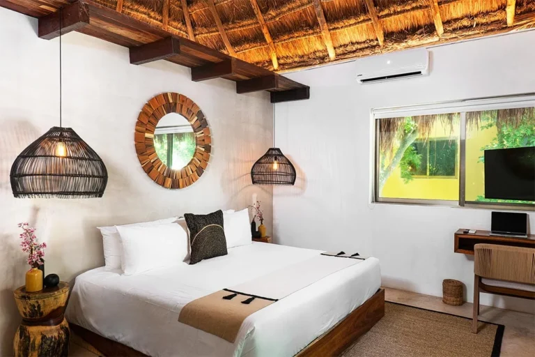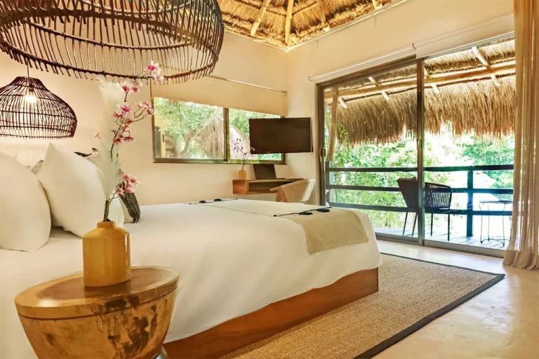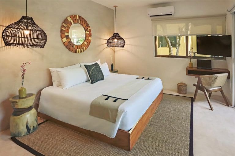 Habitación con cama King, decorada con un hermoso techo de palapa realizada por artesanos locales y materiales naturales de la zona. Dotada con ropa de cama y amenidades de lujo, balcón con vista exterior, cocineta con minibar, horno microondas y cafetera Nespresso, caja de seguridad, aire acondicionado y baño privado con agua caliente.