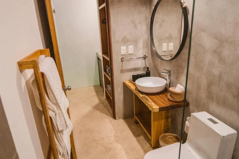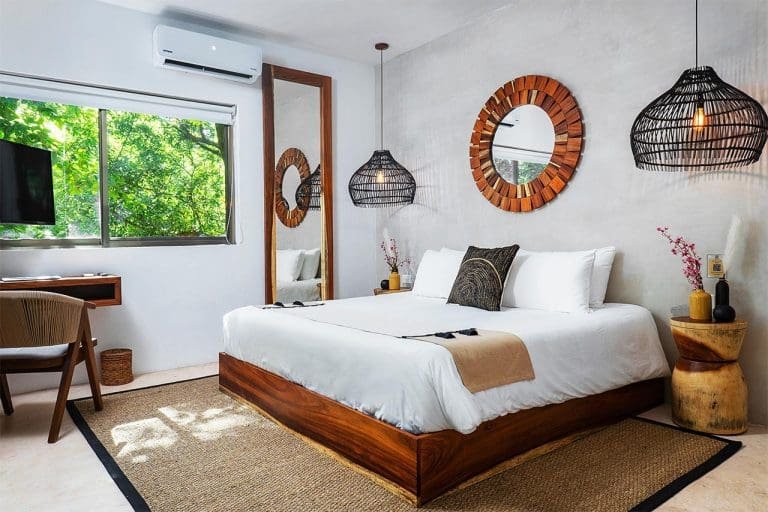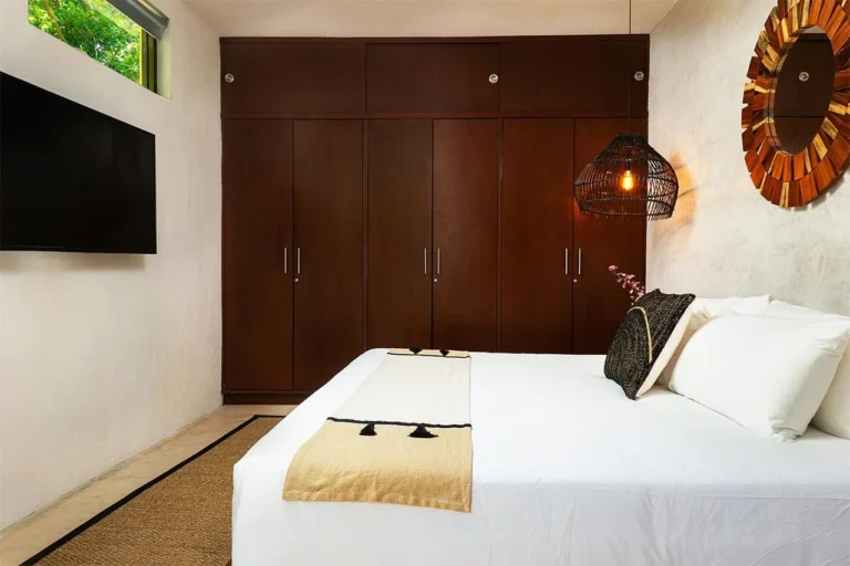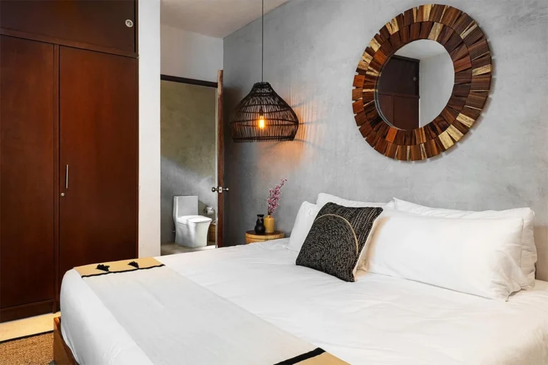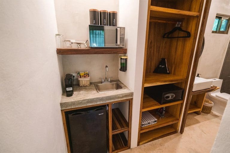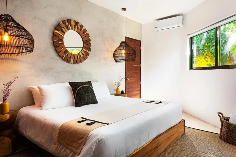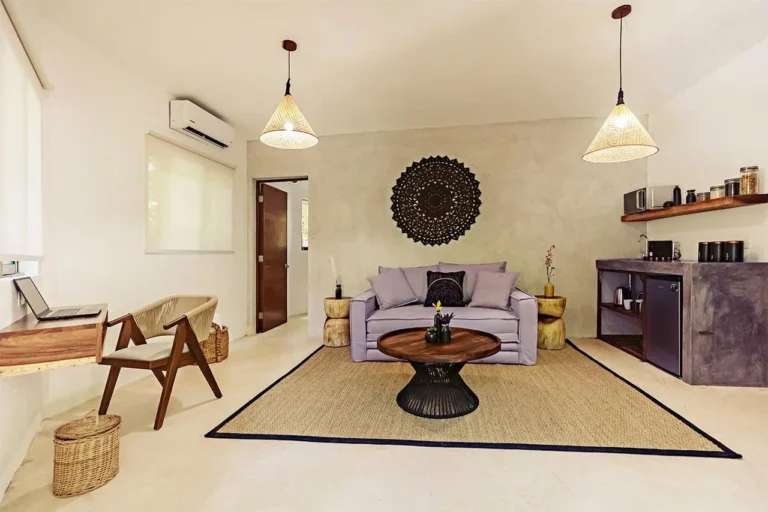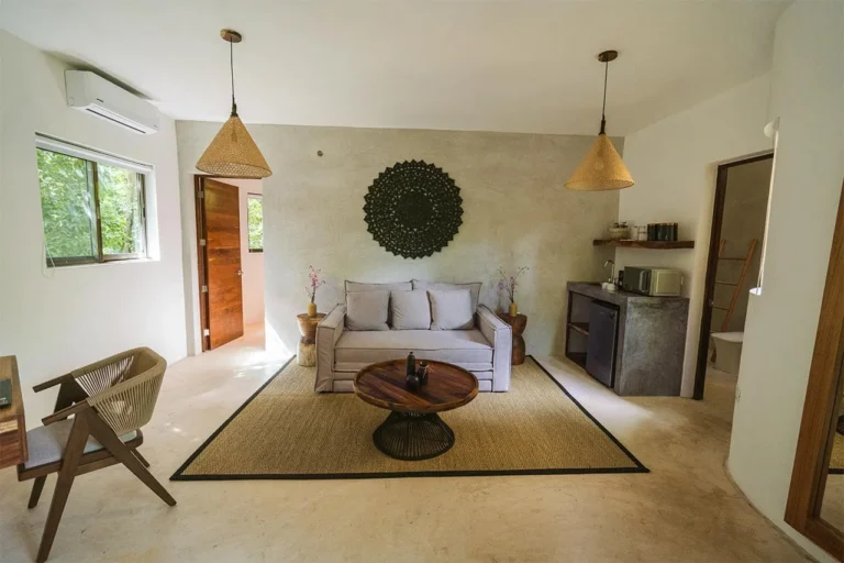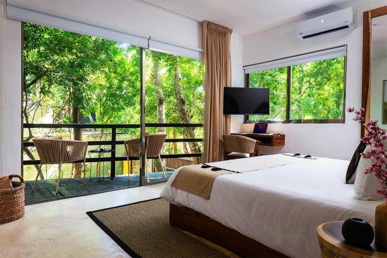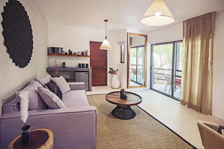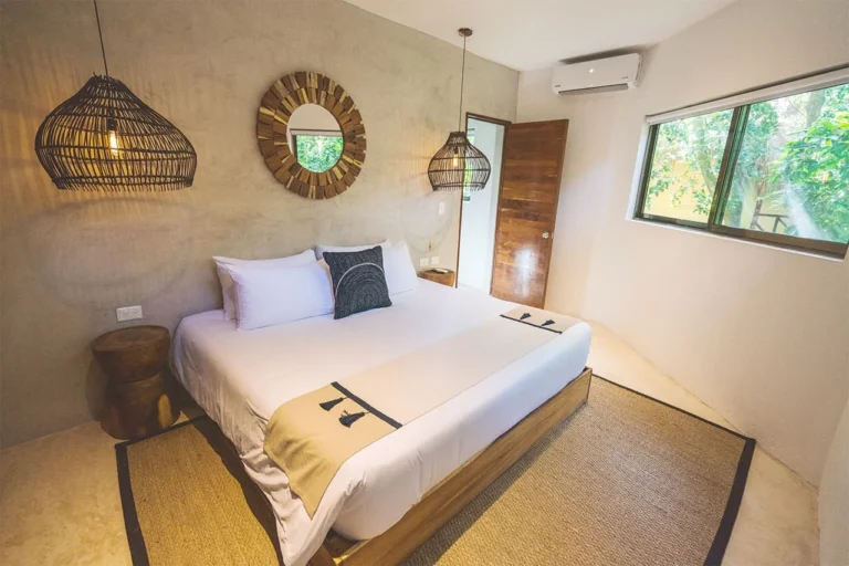 Habitación con cama King, decorada con un hermoso techo de palapa realizada por artesanos locales y materiales naturales de la zona. Dotada con ropa de cama y amenidades de lujo, balcón con vista exterior, cocineta con minibar, horno microondas y cafetera Nespresso, caja de seguridad, aire acondicionado y baño privado con agua caliente.
